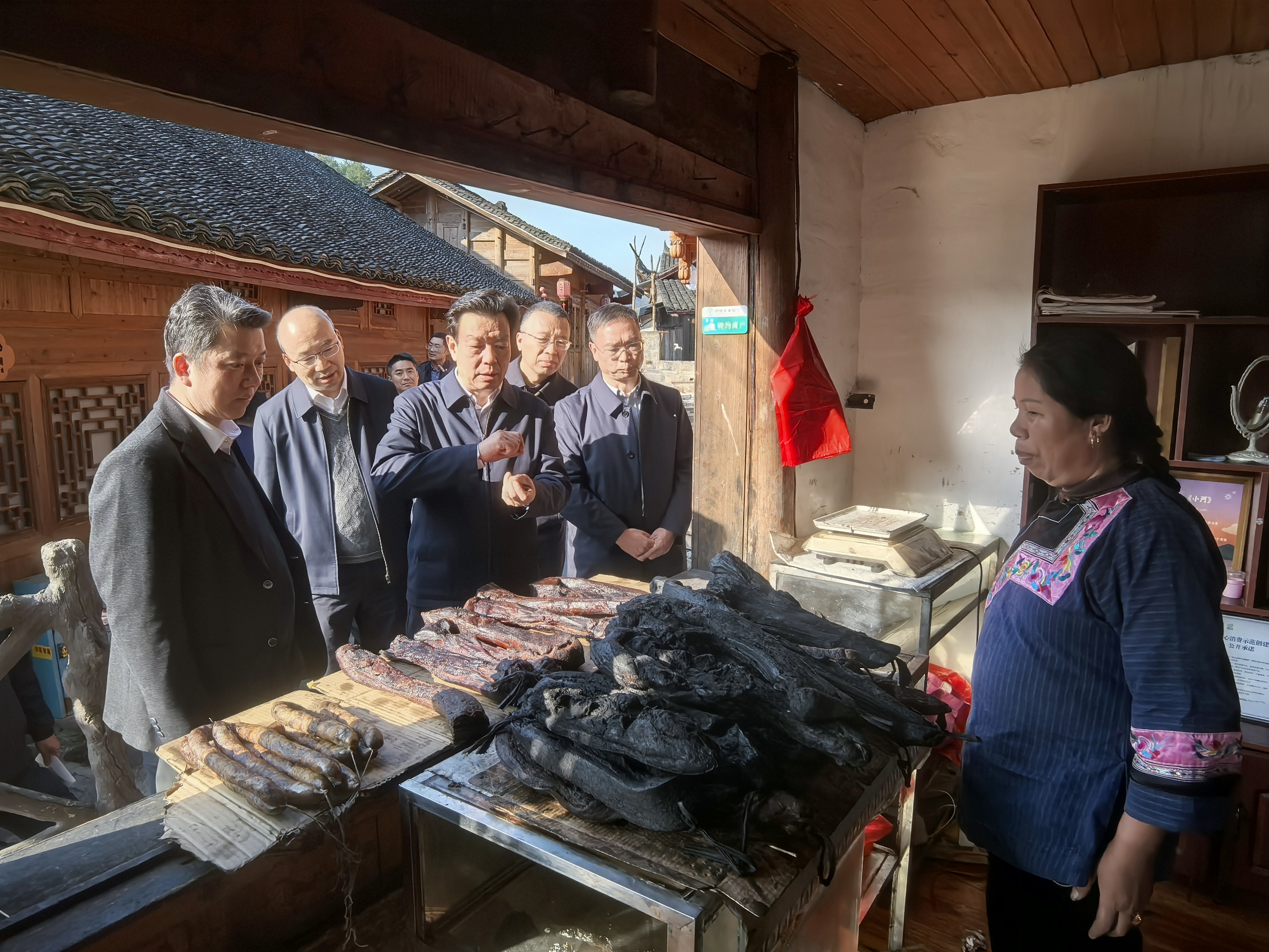 陈得信一行首先参观了十八洞村精准扶贫主题陈列,前往梨子寨苗绣基地和精准坪广场,重走习近平总书记考察足迹,详细询问产业发展、群众增收、苗族传统文化传承等情况;调研了中国五矿援建十八洞村栈道和电商中心项目,排碧村人居环境改善、双龙村美丽乡村文旅项目,深入了解设计建设进度和产品销售情况;与十八洞村“大姐”石拔三、退休教师杨东仕亲切交谈,慰问双龙村脱贫户施继生和施国远,关心他们的生产生活状况。陈得信充分肯定了中国五矿多年来定点帮扶花垣县取得的积极成效,要求高标准、严要求推动项目建设,强化质量、安全和卫生管理,突出民族文化特色开展规划设计,把帮扶项目实施好、运营好、管理好,充分带动当地发展、惠及广大群众。
